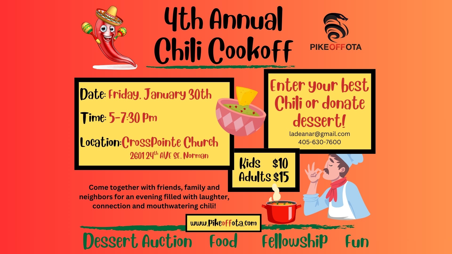 4th Annual Chili Cookoff – January 30, 2026 + Add to Google Calendar + iCal / Outlook export The event is finished. Tags: Chili Cookoff, crosspointe church, event, Fundraiser, No More Turnpikes, Norman Oklahoma, Oklahoma Turnpike Authority, OTA, Pike Off OTA Date Jan 30 2026 Expired! Time 5:00 pm - 7:30 pm Location Crosspointe Church Share this event